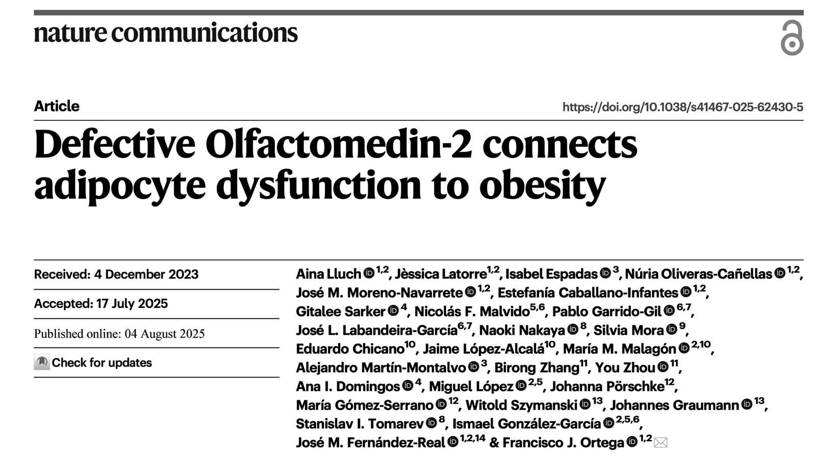 Aina Lluch , Jèssica Latorre, Isabel Espadas , Núria Oliveras-Cañellas, José M Moreno-Navarrete, Estefanía Caballano-Infantes, Gitalee Sarker, Nicolás F Malvido , Pablo Garrido-Gil, José L Labandeira-García, Naoki Nakaya, Silvia Mora, Eduardo Chicano, Jaime López-Alcalá, María M Malagón, Alejandro Martín-Montalvo , Birong Zhang, You Zhou, Ana I Domingos , Miguel López, Johanna Pörschke, María Gómez-Serrano, Witold Szymanski, Johannes Graumann, Stanislav I Tomarev, Ismael González-García, José M Fernández-Real, Francisco J Ortega.